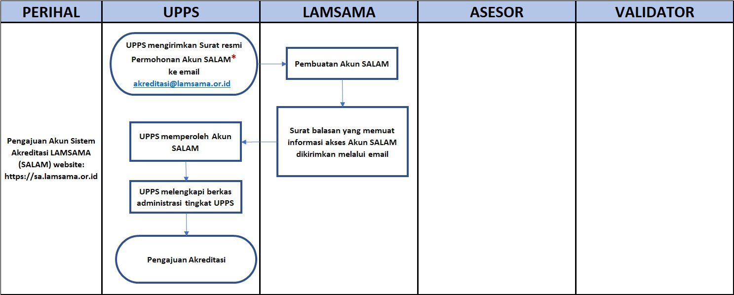 Pengajuan akun SALAM dapat dilakukan dengan mengirimkan surat resmi permohonan akun SALAM. Surat tersebut dikirimkan ke email akreditasi@lamsama.or.id, dengan mencantumkan informasi sebagai berikut: